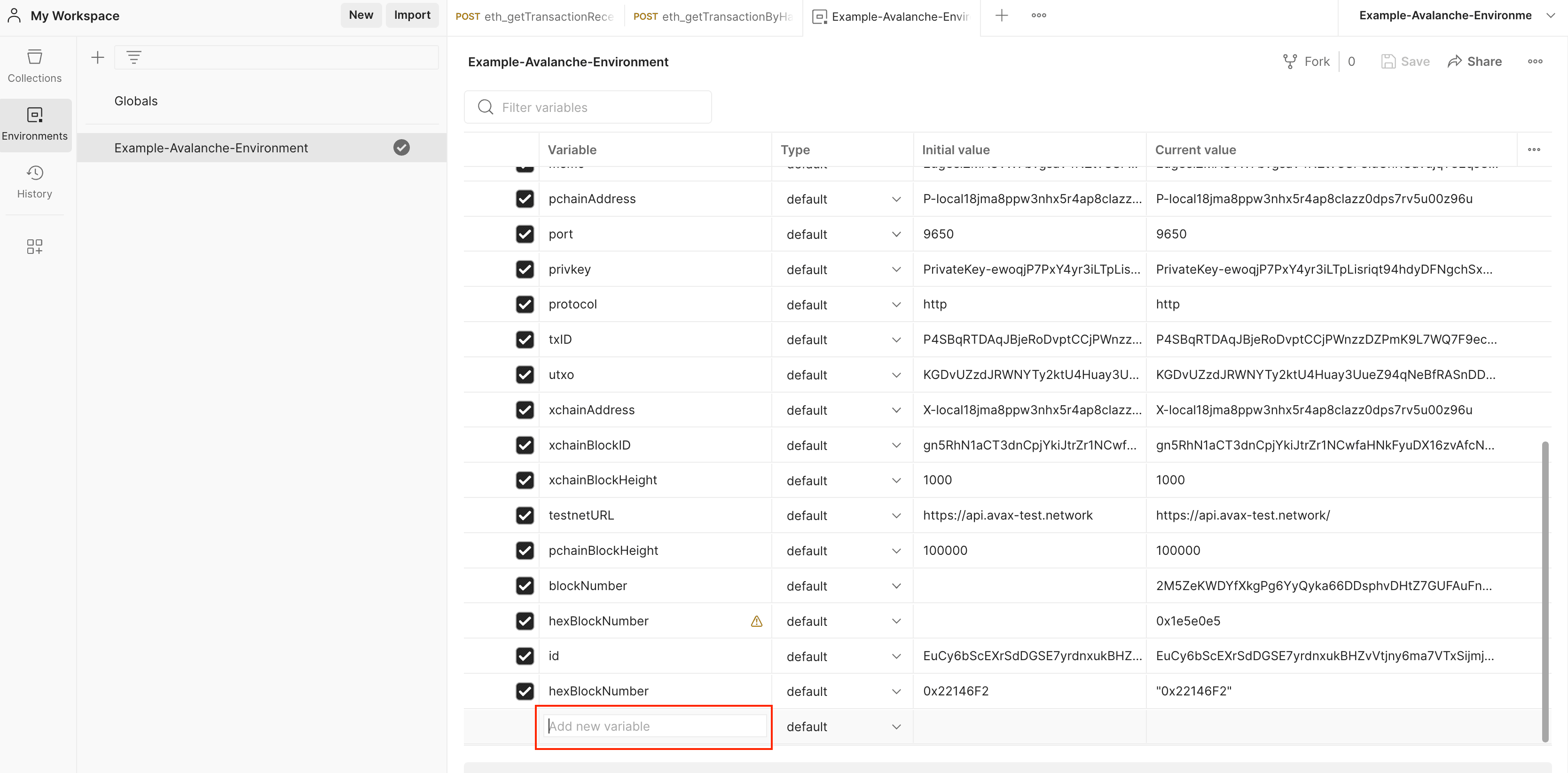 Only default variables are used in the Avalanche Environment file. To learn more about using the secret type of variables, please checkout the Postman documentation.